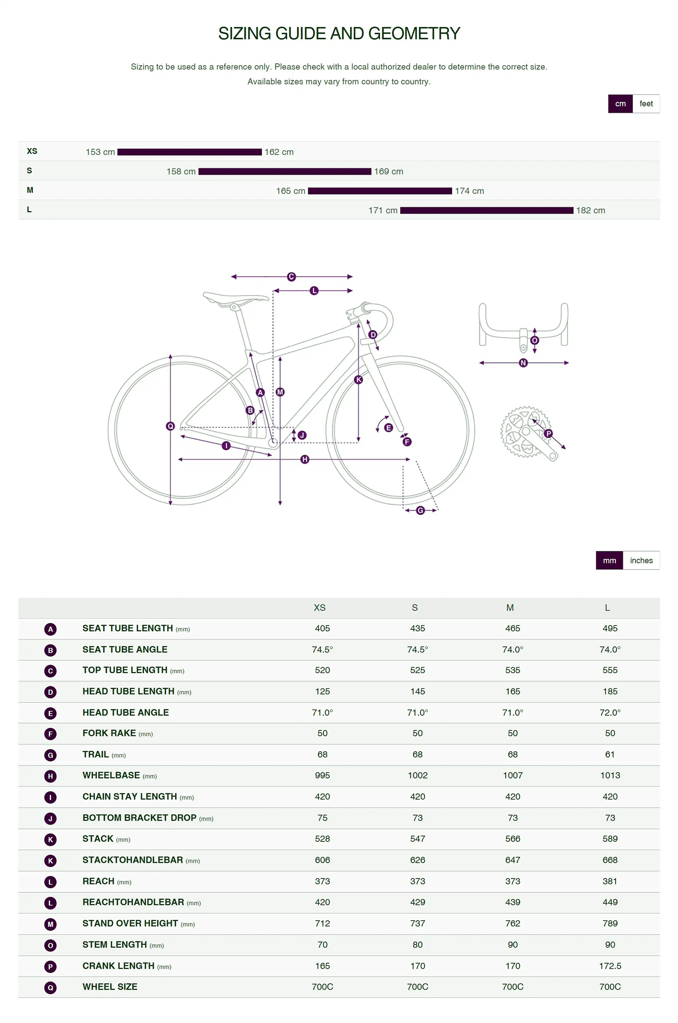 Crankset: Shimano 105, 34/50 XS:165mm, S:170mm, M:170mm, L:172.5mm