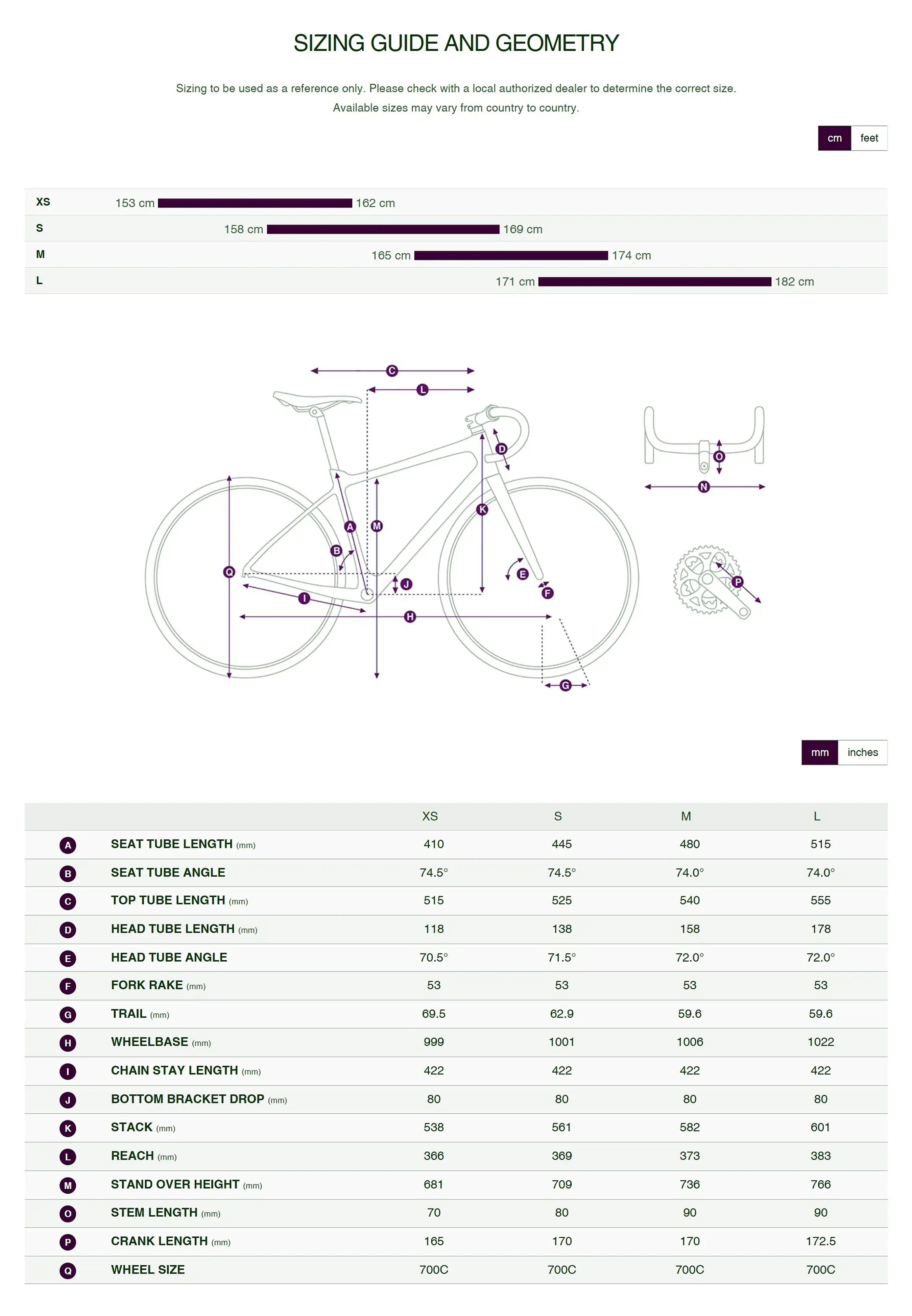 Crankset: Shimano RS520, 34/50 XS:165mm, S:170mm, M:170mm, L:172.5mm