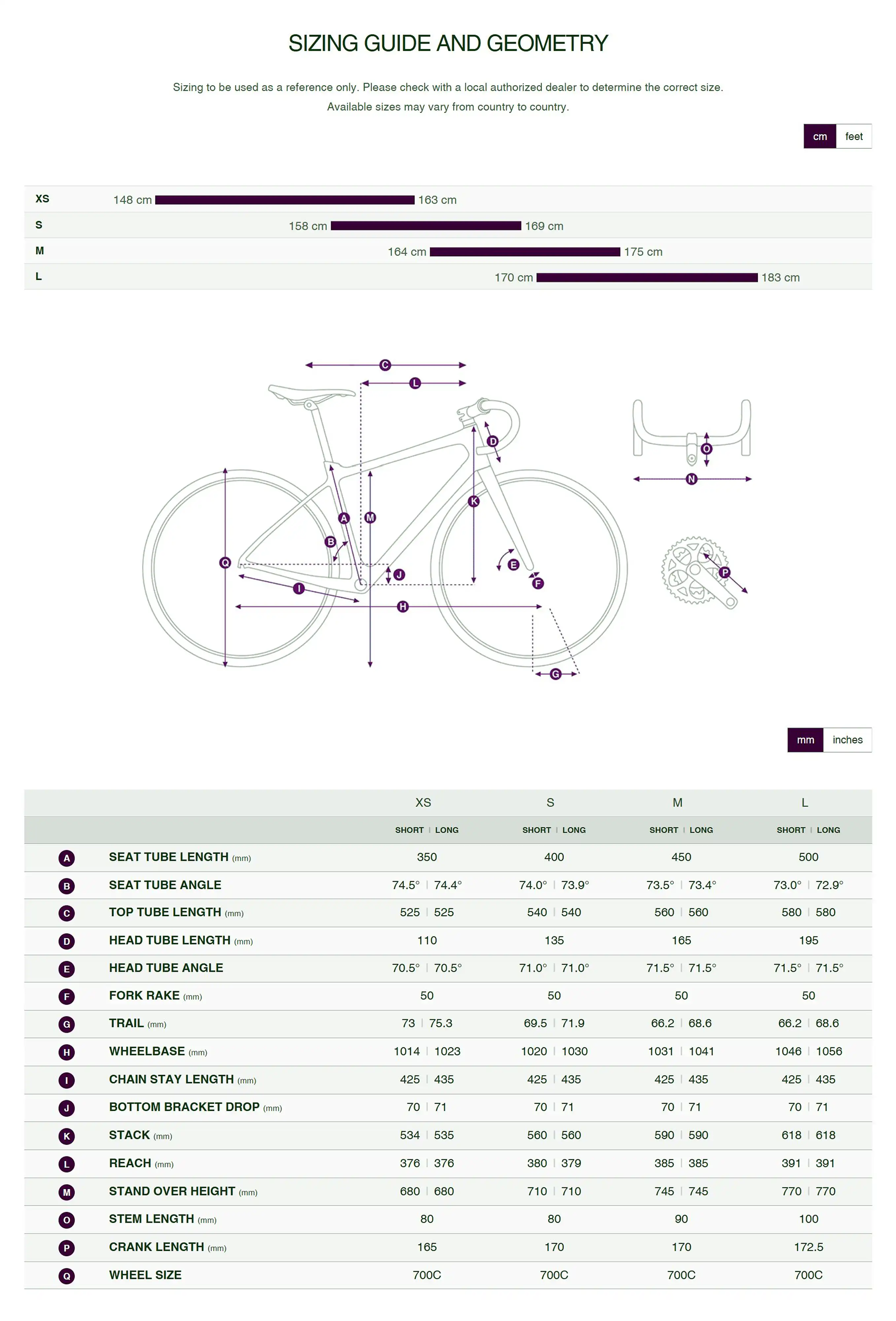 Crankset: SRAM Apex, 42, XS:165mm, S:165mm, M:170mm, L:172.5mm